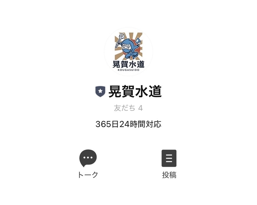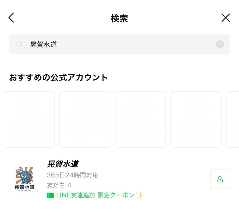 QRコードもしくは、公式ライン検索の画面に「晃賀水道」と検索して頂ければ、出てきます。